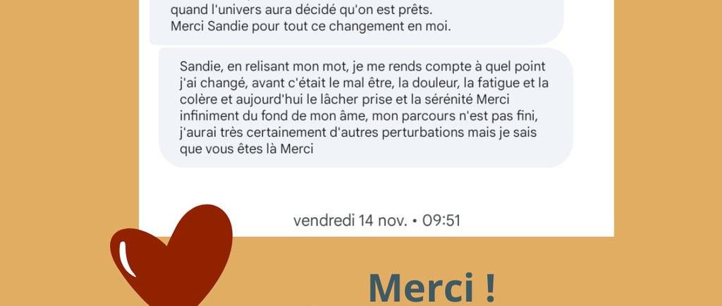 Evidemment, le changement ne s'est pas fait en un jour. MB, la cliente qui m'a envoyé ce message, ça fait plus de 6 mois que je la suis. Les premiers résultats ont été là dès 3 séances mais un changement profond demande du temps. Elle ne s'y est pas trompée. Et si je la vois moins maintenant, elle sait que je suis toujours prête à l'aider quand les difficultés apparaissent. Et ça, ça adoucit sa vie.